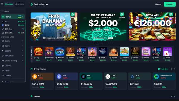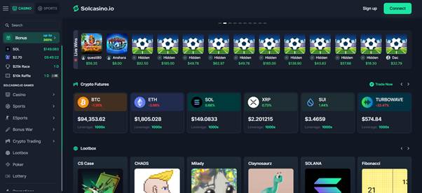 Launched in December 2021, Solcasino.io is a fully crypto-based online casino built on the Solana blockchain. As the first licensed casino platform on Solana, it enables players to gamble directly from their Web3 wallets, supporting over 25 cryptocurrencies including BTC, ETH, SOL, MATIC, BNB, and AVAX.