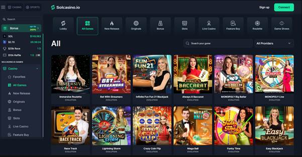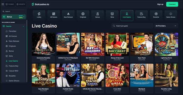 The live dealer section at Solcasino.io offers multiple tables streamed in real time. You’ll find live versions of blackjack, roulette, baccarat and poker – often with several variants (e.g. American/European roulette, Classic Blackjack, Blackjack Surrender, Live Baccarat, Texas Hold’em and more). Game-show style tables are likely also available (e.g. Evolution’s Crazy Time, Monopoly Live or Dream Catcher, though specific titles may vary). Evolution Gaming (the market leader) powers many of these tables, and other live studios (Pragmatic Play Live, etc.) are featured too. The live games run 24/7, giving players around-the-clock dealer action. Betting limits vary by table, so both casual and high-stakes players can find suitable rooms. The live interface is immersive and user-friendly, with chat support and clear game rules. (For example, popular live titles include Lightning Roulette and Crazy Time, which pair fast gameplay with bonus multipliers.) Live winners can cash out instantly via the crypto wallet.