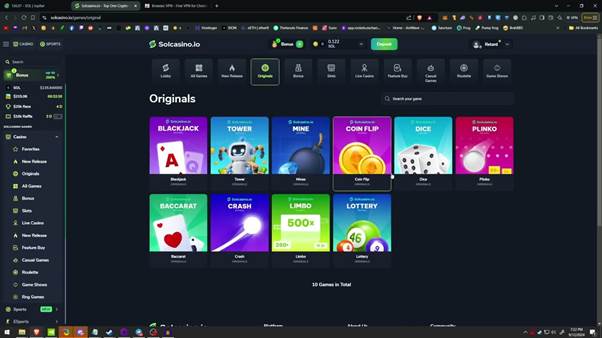 Solcasino.io does not currently list a dedicated Crash game category so titles like JetX (by SmartSoft Gaming) or Aviator (Spribe) may not be found in the menus. In general, instant-win or crash-style games are popular in crypto casinos, but Solcasino’s focus remains on slots, tables and live dealers. (It’s worth checking if crash-like “Lightning” or “Binomial” mini-games appear in the live section.) Regardless, Solcasino does offer provably-fair features in other ways (for example, its on-chain lottery is fully verifiable). If you enjoy crash games, you may need to play them on other Solana casino sites – Solcasino itself emphasizes its traditional casino catalog.